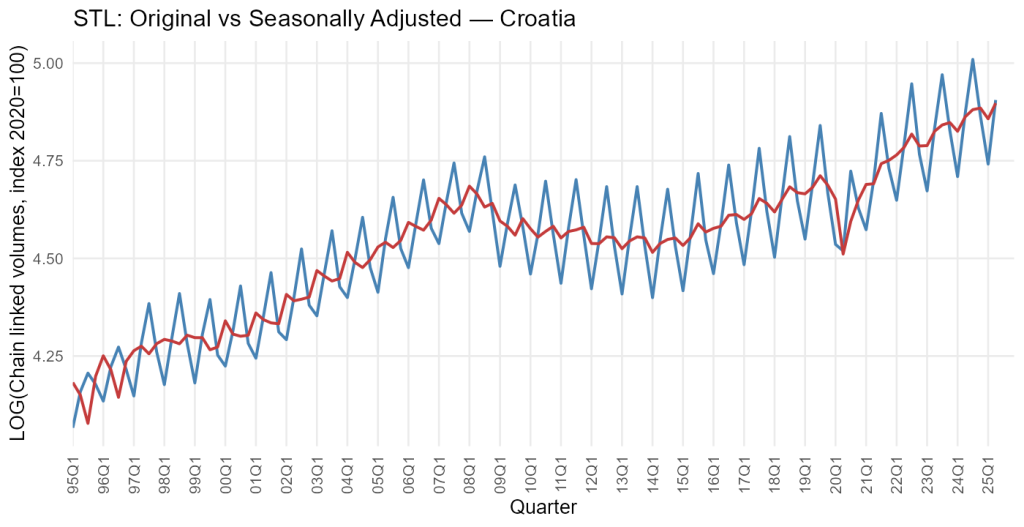 Figure 1 plots the original and STL-adjusted logarithm of Croatia’s real GDP. The original series displays pronounced intra-year swings, reflecting the familiar rhythm of the Croatian economy: weak activity in the winter quarters, a pick-up in spring, a powerful summer peak driven by tourism and related services, and a cooling in the final quarter of the year. The seasonally adjusted series strips out this regular pattern and reveals a smoother trajectory that is easier to align with macroeconomic events.