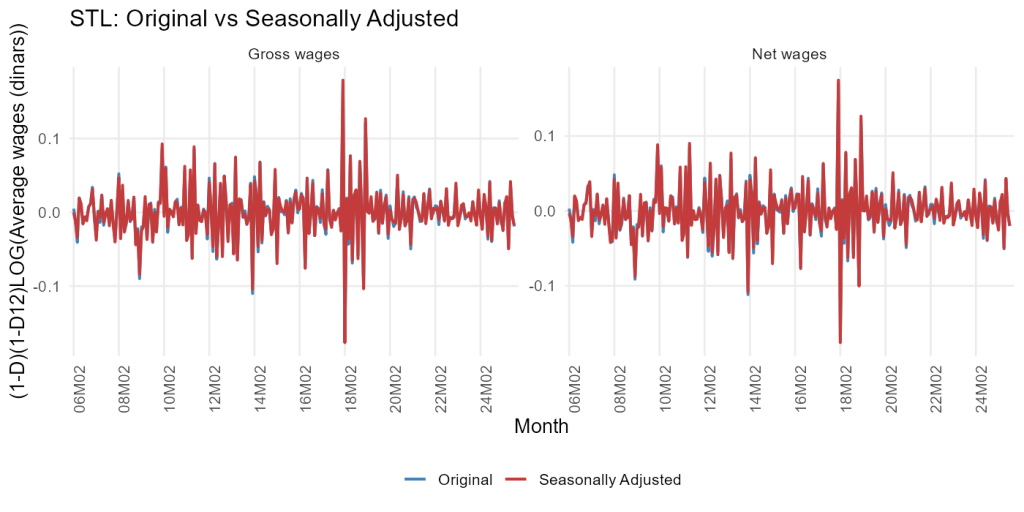 Comparing gross and net wages confirms that the tax-contribution wedge shifts levels but not the skeleton of dynamics. Where differences in seasonal amplitude occur, they are small and episodic. The latest panels indicate a return to normalisation after the extraordinary pandemic-inflation sequence: the slope of the adjusted log series has moderated, and seasonal patterns look more like their mid-2010s selves.