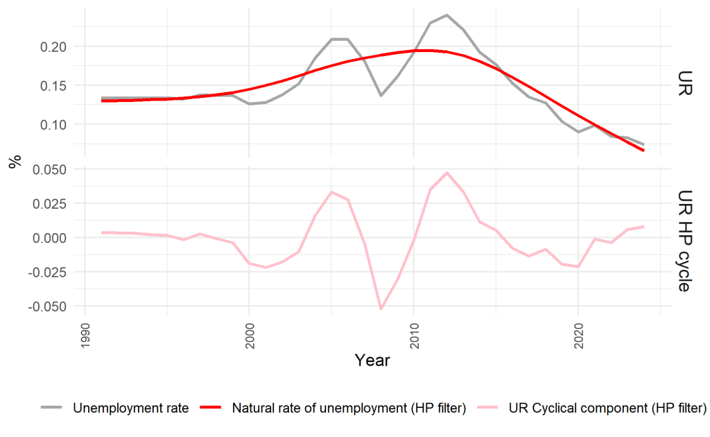 The study’s HP-filter output gap is defined as the difference between actual GDP and the trend component of the filter (the estimated potential output). As shown in Figure 3 the output gap turns negative in underperformance periods and positive in above-trend periods, with major negative gaps around 2000–2002, 2009–2011, and 2020–2021, and shorter positive gaps around 2005–2007 and 2017–2019.